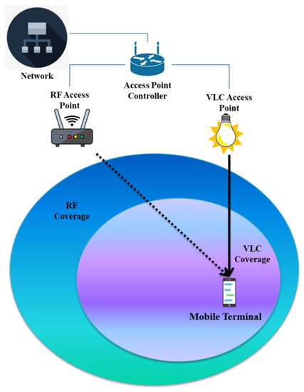 - Rahaim, M.B.; Vegni, A.M.; Little, T.D.C. A Hybrid Radio Frequency and Broadcast Visible Light Communication System. In Proceedings of the 2011 IEEE GLOBECOM Workshops (GC Wkshps), Houston, TX, USA, 5–9 December 2011; IEEE: Piscataway, NJ, USA, 2011; pp. 792–796. [Google Scholar] [CrossRef]
