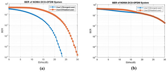 In Figure 9, we have provided BER performance analysis for NOMA-DCO-OFDM for two users (User1 and User2). We analyzed the impact of power allocation on BER performance for each user. In Figure 9a, we consider power allocation as 0.9 and 0.1 for User1 and User2, respectively. While in Figure 9b, we consider power allocation as 0.6 and 0.4 for User1 and User2, respectively. Our results show that a significant power allocation difference between both users can give better BER performance.