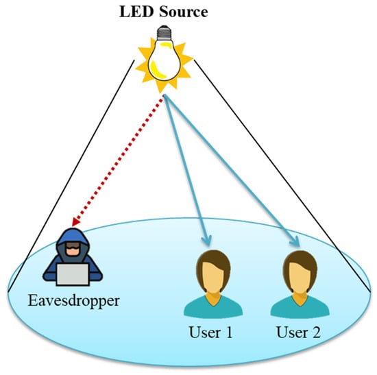 NOMA-VLC system with two users and an eavesdropper.
