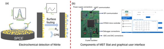 Graphical abstract of (a) Developed electrode for determination of nitrite and its surface characterization, and (b) The components of MSTStat and images of the graphical user interface.