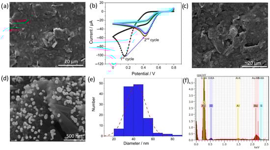 Figure 3d shows magnified SEM images of the Au nanoparticles. Variations in the size distribution and shape can be observed in the image. Non-uniformity arises due to the interaction and agglomeration of neighboring nanoparticles, leading to differences in shape and size. The histogram in Figure 3e reveals the size distribution of Au nanoparticles to be approximately 30–50 nm on the surface, and only a few extend up to 90 nm in diameter. Figure 3f shows energy-dispersive X-ray spectroscopy (EDX) measurements for elemental identification of the EdAu/SPCE surface. An overlap of the Au emission carbon peak is observed at approximately 0.2 keV and a distinctive peak is clearly visible at approximately 2.2 keV. The peaks for aluminum (Al) and sulfur (S) stem from the sample holder and the activation procedure implemented for the EdAu/SPCE by using sulfuric acid, respectively.