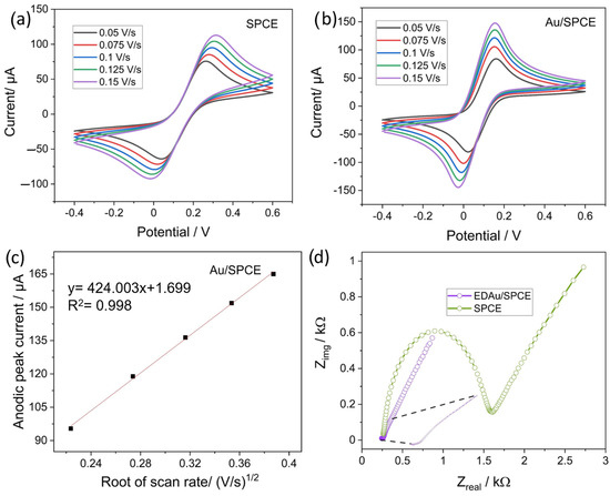 The electrochemical properties and electron transfer kinetics of the SPCE and EdAu/SPCE were investigated using CV and EIS. Figure 4a,b show the CV curves of the K3Fe(CN)6]3−/4−redox couple on the bare SPCE and EdAu/SPCE electrodes at different scan rates, respectively. The EdAu/SPCE electrodes displayed an enhanced current compared to the bare electrode. Furthermore, the peak potential difference between the oxidation and reduction peaks was reduced considerably from 0.221 to 0.140 V for the EdAu/SPCE electrodes, suggesting the high conductivity and catalytic activity of Au nanoparticles on carbon electrodes. Figure 4c shows the linearity of the anodic peak currents versus the root of the scan rate for the modified electrodes. Linear behavior with an R2 value of 0.998 was observed for the EdAu/SPCE electrodes, which confirms the diffusion-controlled process involved on the surface [15].