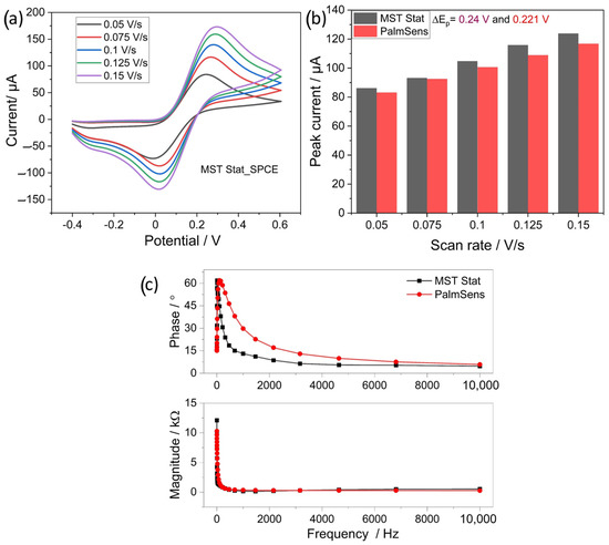 The performance of the developed MSTStat for CV and EIS was evaluated by comparing the curves obtained for the bare electrodes with those of the commercial potentiostat PalmSens. Figure 5a shows the CV curves for 5 mM of K3Fe(CN)6]3−/4−solution on the bare electrode by MSTStat, and Figure 5b shows a comparison of the currents obtained from both potentiostats. A qualitative analysis of the CV curves obtained with MSTStat (Figure 3a) shows similar behavior to that observed with PalmSens, with the anodic and cathodic peak current increasing with an increase in scan rate and the increase in peak separation. A more quantitative analysis can be visualized through the bar graph in Figure 5b, wherein the observed differences in the peak currents are not significant, with an error percentage of under 6%, even at high scan rates. The results demonstrate the capability of MSTStat to achieve similar performance.