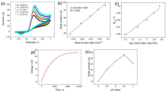 The response of the developed EdAu/SPCE towards nitrite was investigated by CV from 0.1 to 1 V at different scan rates from 0.05 V/s to 0.150 V/s and a concentration of 500 µM. The nitrite solution was prepared in a 0.1 M phosphate buffer solution of pH 7. A clear oxidation peak is visible at around 0.6 V in Figure 6a, which increases and shifts to a higher potential with the increase in scan rate. Furthermore, the linearity in the plot of the peak current versus the logarithm of the scan rate with an R2 value of 0.992 indicates the dominance of diffusion-controlled processes in the oxidation of nitrite. Figure 6c shows a Tafel plot of the anodic peak potential (Epa) versus the root of the scan rate. Linear fitting of the plot leads to an R2 value of 0.993, and the linear regression equation is as follows: