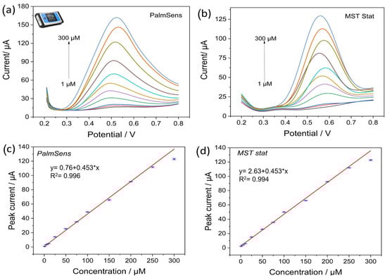 Square wave voltammetric curves at different concentrations for (a) PalmSens, (b) MSTStat and (c,d) the calibration curves with the linear regression equation for PalmSens and MSTStat respectively.
