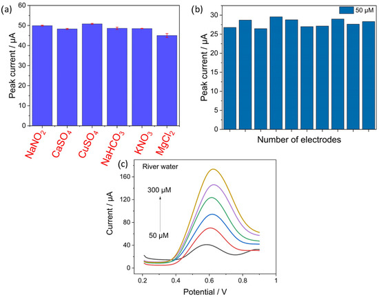 The selectivity of electrochemical sensors is a crucial aspect to be investigated to evaluate sensor performance. In this regard, the most common interferant ions present in water, namely calcium sulfate (CaSO4), copper sulfate (CuSO4), sodium bicarbonate (NaHCO3), potassium nitrate (KNO3), and magnesium chloride (MgCl2) were added in 50 times excess of concentration as compared to nitrite in 0.1 M PBS solution of pH 6.5. The concentration of nitrite for the selectivity tests was 100 µM and that of the interferants was 5000 µM. The bar graph in Figure 8a shows the corresponding peak currents obtained from the oxidation of nitrite in the presence of other possible interferants with standard deviation obtained from three measurements. The plot shows no significant changes in the peak currents in the presence of high interference concentrations, with a maximum relative error of less than 12% for MgCl2. The results demonstrate the high selectivity achieved by the EdAu/SPCE electrodes. The reproducibility of the electrochemical sensors was quantified by fabricating 10 electrodes with the same procedure and running SVW at a nitrite concentration of 50 µM. The recorded response does not show any significant deviations across the 10 electrodes as shown from the bar graph in Figure 8b, inferring the high reproducibility of the developed electrodes.