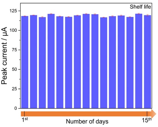 - Shelf life of the sensors: In this analysis, the response of the as-fabricated electrode was recorded in triplicate at a nitrite concentration of 300 µM for 15 days. As shown in Figure 9, the changes in the peak current values did not deviate significantly over the entire 15 days, thus confirming the good shelf-life capability of the developed electrode. It should be noted that 15 days was selected for analysis, not that the electrode drifted in the response afterward, but to demonstrate that the electrode developed in this work if left in dry conditions after measurement, does not show much deviation in the response.