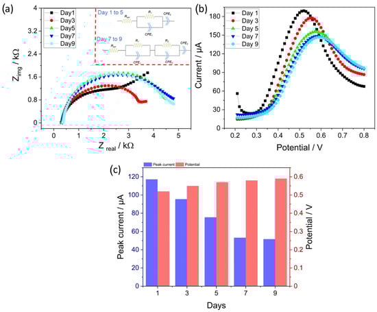 Figure 10a shows the EIS spectra obtained after the SWV measurements were taken every day. Qualitative inspection of the spectra revealed significant changes as the number of days increased. The inset of Figure 10a shows the equivalent circuit used to fit the spectra. In this regard, from days 1 to 5, the equivalent circuit elements include a solution resistance (Rsol) in series with an RC element and CPE element to model diffusion. The CPE was considered instead of the capacitor, owing to the imperfections associated with the double layer. Furthermore, CPE was also selected to model the diffusion, due to the surface roughness and inhomogeneities. It can be observed that only one RC element was sufficient to fit the equivalent circuit for the spectra obtained until the 5th day. However, as shown, an additional RC element was required to fit the spectra for days 7 and 9. The physical explanation for the 2nd RC element can be related to the formation of a thin passivating layer on the surface of the electrode owing to fouling, which creates an additional barrier for ions to diffuse to the surface of the electrode [66].