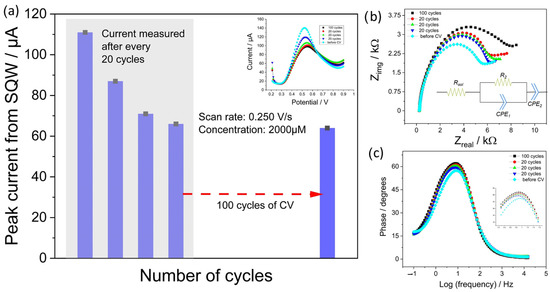 Figure 11 shows the EIS and SWV measurements obtained after the initial 25 SWV scans in the presence of the same concentration of nitrite. As depicted in Figure 11a, the current decreased substantially after the first and second cycling by CV at high scan rates and concentrations from 111 to 87 and 71 µA, respectively. However, after the third CV cycling, the reduction in current was lower (66 µA). To further elevate the deterioration of the electrode, 100 CV cycles with the same parameters were performed on the same electrode. Nevertheless, the electrode was able to sustain the high stress by showing only a reduction of approximately 3 µA in the current (63 µA). The results demonstrated that after 160 cycles of high stress on the electrode, an approximately 50% reduction in the current was observed. Figure 11b,c show Nyquist and Bode plots recorded after each cycling phase on the electrode. The parameters selected for EIS were similar to those of the immersion tests and were measured in the presence of nitrite in the PBS solution. A considerable change in the spectra was observed from the Nyquist plot, with the charge transfer resistance changing from 5237 Ω without any cycling to 7021 Ω after 100 cycles of scanning.