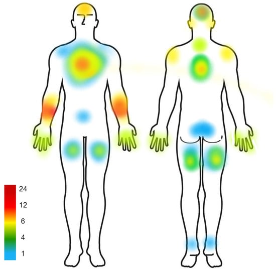 | Mirzaei et al. 2021 [34] | A suit with fixed vibromotors that used vibrations to indicate the direction of sounds in VR. It is meant to enhance the experience of the user that is wearing the suit. | Suit with two fixed linear resonant actuator vibromotors (one in the chest and one in the upper back), combined with two additional vibromotors either on: the thighs, the upper arms, or the ears. | Chest and upper back, along thighs, upper arms, or ears. | 4 | Yes | 20 participants with hearing impairment. | (1) Using haptic devices in VR can help deaf persons to complete sound-related VR tasks faster. (2) The efficiency of completing sound-related VR tasks is not related to the number of haptic devices on the suit. |