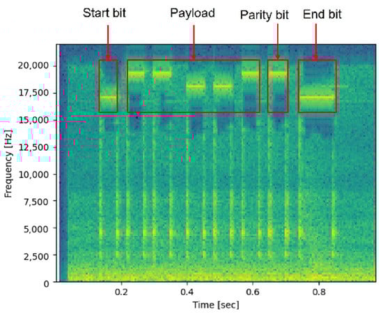 In the experiment of encoding data with binary code, the length per bit was set to 50 ms. We conducted an experiment transferring an arbitrarily determined binary code, 11001. We transferred the 50 ms long start bit at a frequency of 17 kHz. The 0 was transferred at a frequency of 18 kHz and 1 transferred sent at a frequency of 19 kHz. The next bit was an even parity bit. The even parity bit becomes 0 if the total number of 1-bits is even, and 1 if odd. In our experiment, the parity bit was 1. The last bit was the end bit. In this experiment, the end bit is the same frequency as the start bit at 17 kHz and the length is twice as long as 100 ms. The results of our experiment are shown in