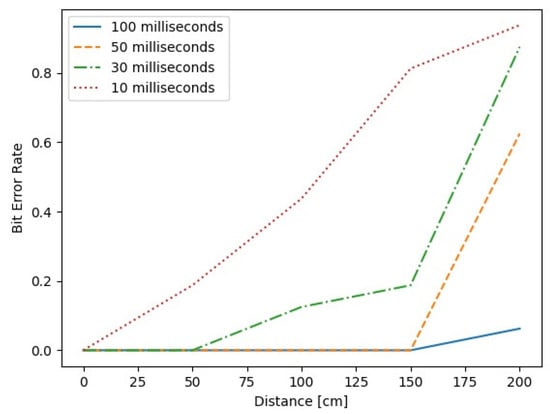 Figure 4, our results show that if the length per bit is 100 ms, it is possible to transfer a bit at a distance of up to 1.5 m without error. This result shows that the maximum bit rate is 20 bits/s when the length per bit is 50 ms.