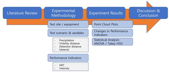 | Tang et al. [12] | Real road (parking lot) | Rain | Estimating probability of pedestrian detection significantly decreased on rainy days | The relationship between the actual amount of rainfall and the detection performance of LiDAR could not be proven |
