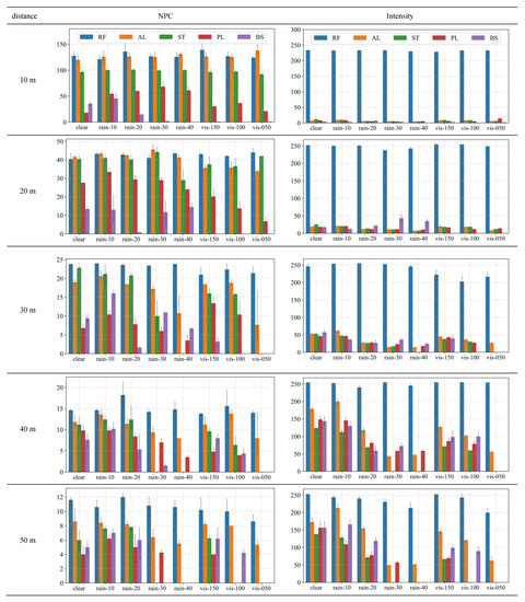 | Kim et al. [22] | Real road | Rain | Distance and rainfall affect NPC and intensity Materials affect intensity. Speed does not affect the detection performance of LiDAR. | Correlation between all factors could not be confirmed |
