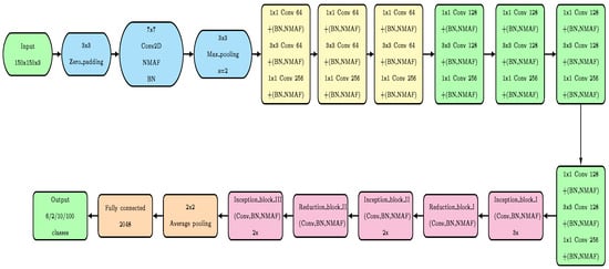 Although our proposed method adopts the inception technique proposed in [28], our proposed model differs from [28] in many aspects. Firstly, in our proposed model, we adopt our proposed non-monotonic activation function (NMAF) instead of Relu. Secondly, the number of inception and reduction blocks is relatively different from that in [28]. Thirdly, the number of filters in each block and the sizes of each filter differ from [28]. Fourthly, in the classification layer, we apply an average pooling filter instead of global average pooling. Based on our experiments, we found that utilizing global average pooling significantly degrades classification accuracy. Fifthly, unlike [28], we did not find applying dropout essential in our network. Sixthly, in our neural network, we avoided adding an auxiliary classifier. We found that adding the auxiliary classifier causes instability during training, thus can decrease the classification accuracy as the number of classes increases.
