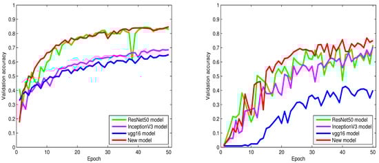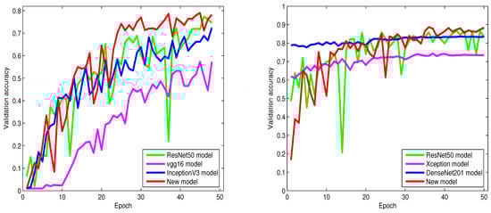 Figure 4, Figure 5 and Figure 6 show the behaviors of six different models. From these figures, we can discover that our proposed algorithm converges faster than other models. As shown in Figure 4 (left), from epoch zero to epoch 25, our proposed algorithm sometimes shows slightly lower accuracy than ResNet50. However, from epoch 25 and above, our proposed algorithm gradually achieves higher classification accuracy and convergence than ResNet50.