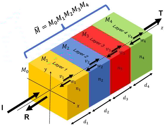 The transfer matrix method in optics [23] is an effective and convenient mathematical method for yielding the transmission and reflectance characteristics of the thin film stack. We assume there is neither scattering nor absorption that occurs in the thin film. When an incident light enters a boundary divided by two materials that have different refractive indexes, , and , it leads to the transmission and reflectance of the incident light. The ratio of the incidence angle and the refraction angle can be obtained by Snell’s law: