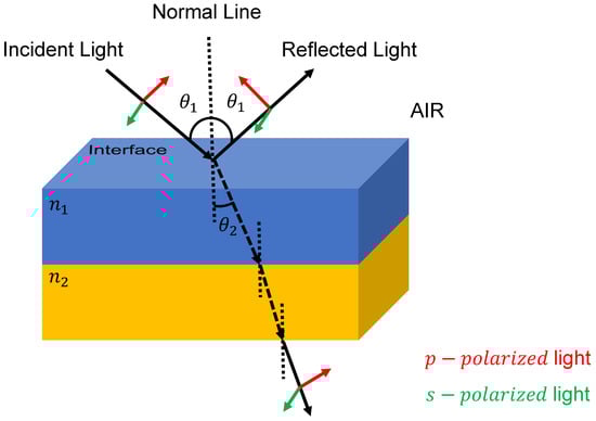 Diagram of the p-polarized light and s-polarized light. The electronic field of p-polarized light is parallel to the plane of the incident light, while the s-polarized light is perpendicular to the incident plane. For convenience, we refer the and as the refractive index for two different materials.