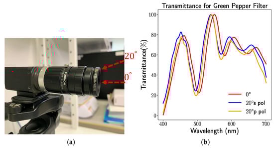 As illustrated in Figure 4, the Chroma Technology Corporation successfully fabricated the optical filter designed by our previous proposal method Optical Filter Net [3] for green pepper segmentation. Figure 4a demonstrates our fabricated optical filter with a machine vision camera system. We called our fabricated optical filter a Green Pepper Filter. Our Green Pepper Filter was made for the M filter thread. The camera in our system is the LUCID Vision Triton 5.0 Camera equipped with a 2/3 inch Sony IMX264 CMOS sensor [25]. The objective lens is FUJINON HF12 XA-5M 1:1.6/12mm. As shown in Figure 4b, our Green Pepper Filter cannot guarantee the stability of the transmittance curve for the oblique incident. Our implemented optical thin film comprises the (refractive index ) and (refractive index ), and the layer number is 60, whereas the thickness of each thin layer of the Green Pepper Filter is unknown to us. To facilitate implementing our wide-angle optical filter design, we follow similar parameters setting with our already implemented optical thin film, e.g., the same materials and same number of layers. Optical glass (refractive index ) is chosen as a substrate in our experiment. The whole structure of our optical filter is based on an elemental type thin film structure, which can be described by {Air|2.3|1.46|…|2.3|1.46|Optical Glass}.