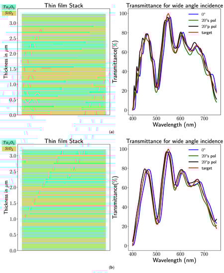 Despite the benefits of the transfer matrix method, drawbacks remain. It is restrained to the linear, homogeneous thin film stack and limited geometrical structures. Therefore, a further study focusing on incorporating a deep neural network-based inverse design [33] with some basic optical filter structures is suggested. It is known in the literature [34] that some fundamental thin film stack orders exist, e.g., band-pass filter, long-pass filter, and Fabry–Perot filter design. Integrating those basic filter structures as prior identification might be possible to facilitate optical filter design. Lastly, from the optical coating point of view, the thin film design should be robust to the fluctuations in spectral response caused by a slight thickness variation in each thin layer.