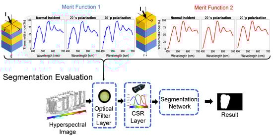 One of the critical insights in our previous study [3] is to model the transmittance curve of the optical filter as one parametric neural network layer, connecting those layers with the segmentation neural network (i.e., U-Net structure for green pepper segmentation) and ultimately utilize back-propagation to refine the transmittance curve of the optical filter in a hyperspectral image dataset. The whole optical system, optical filter with the RGB camera, can be accurately simulated by optical filter layer with the CSR layer. The synthesized RGB image can be considered a three-channel feature map inside the deep neural network structure. To compare each transmittance curve, we replace each of them in the optical filter layer respectively and evaluate the segmentation performance. As demonstrated in Figure 7, we fix the weight of the camera spectral response layer and segmentation network for fair comparisons. We change the weight of the optical filter layer with different transmittance (TR) curves of the already implemented optical filter and proposal merit functions 1 and 2 at and . We adopt the camera spectral response (CSR) from the Lucid Triton 5.0 machine vision camera [25].