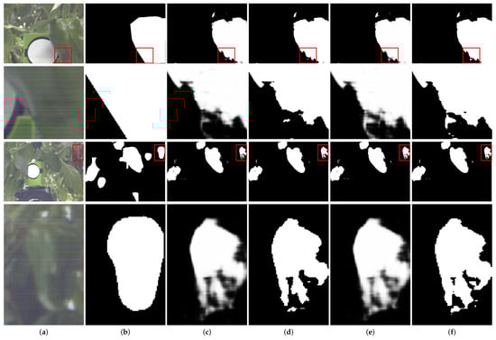 Visual comparison on segmentation results. The red box in rows 1 and 3 are enlarged in rows 2 and 4, respectively. (a) The RGB image and relate patch details. (b) Ground truth. (c) Prediction of simulated Green Pepper Filter. (d) Binary prediction of simulated Green Pepper Filter. (e) Prediction of merit function 2. (f) Binary prediction of merit function 2. Note that our proposed merit function can improve the green pepper segmentation results.