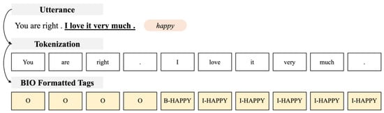 Figure 2 shows an example application of the BIO format. It is assumed that the utterance “You are right. I love it very much” occurs. Tokenization is used based on the space. In the cause “I love it very much,” the initial token “I” is represented as [B-HAPPY], and the remaining tokens are expressed as [I-HAPPY]. The utterance “You are right,” which does not belong to any emotion, is described as [O]. This example is intended to easily represent how we apply it and should only be referred to as an understanding of the application method because it differs from the actual tokenization result.