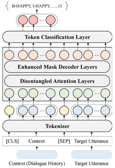 According to the defined problem, we must determine one or more emotion–cause pairs using a given dialogue history and the target interference. We used the BIO tagging scheme to solve this problem. The BIO tagging method is also called an IOB format. A description of the tags used for the model is provided in Table 1. The B-prefix refers to the beginning and represents the token for which the cause of the emotion begins in an utterance. The I-prefix refers to a token inside and represents a token corresponding to the cause of the emotion in an utterance. Finally, O represents a token that does not belong to any emotion and does not correspond to a cause.