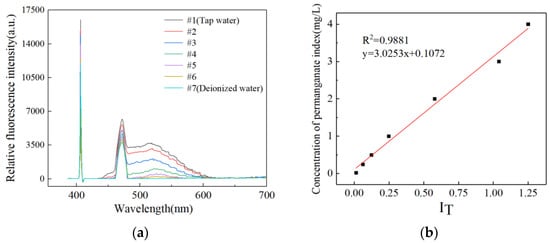 The tap water of Weihai City, Shandong Province, China, is chosen as the testing object. In the preliminary experiment, we prepared seven diluted water samples by diluting tap water with different volumes of deionized water. The mixing ratios of tap water and deionized water were as follows: 1:0, 3:1, 1:1, 1:3, 1:7, 1:15, and 0:1, respectively, which were numbered from no.1 to no.7 in sequence. Then we measured the concentration for the 7 samples according to the water quality—determination of permanganate index (GB/T 11892-1989 issued by China) [19]. The permanganate indices for the seven samples were 4.15, 3.12, 2.04, 0.99, 0.51, 0.26, and 0 mg/L, respectively. In addition, we also tested the 7 samples using the instrument we developed under the same test conditions. The laser spectrum for each sample was collected 50 times. The laser-excited spectra of different water samples are shown in Figure 2a. It can be seen that there are three emission fluorescence peaks in this spectroscopy curve, including the laser source peak at 405 nm, the Raman peak of water at 471 nm, and the fluorescence peak of DOM at 525 nm (mainly comes from esters and aromatics). Under identical laser power, the intensity of the DOM fluorescence increases as the permanganate index increases. The correlation between the ratio of Laser Fluorescence–Raman and the concentration of permanganate index is shown in Figure 2b. The ratio of Laser Fluorescence–Raman (IT) increases with permanganate index at 0~5 mg/L, and a linear regression equation with a correlation coefficient R2 = 0.9881 is obtained: