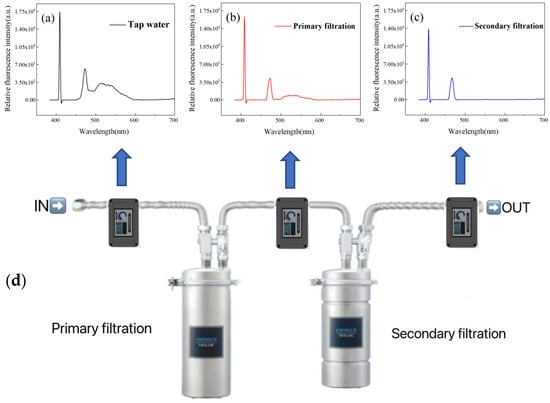 Laser spectral comparison of tap water, primary filtered water, and secondary filtered water. (a) Laser spectra of tap water; (b) Laser spectra of primary filtered water; (c) Laser spectra of secondary filtered water; (d) The two-stage water filtration system and three water quality monitoring spots.