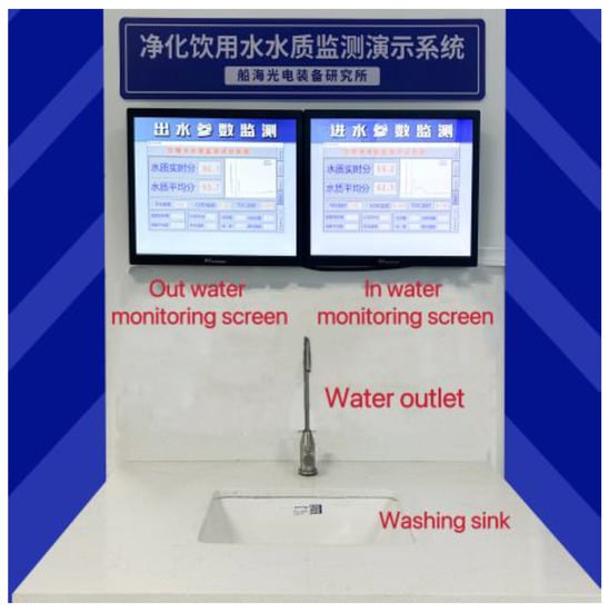 The permanganate index is a key parameter for drinking water quality evaluation. In order to verify its accuracy, we also tested the permanganate index of three spots using the chemical analysis method; their comparison results are shown in Table 4. It can be seen that the relative error of the two methods are 3.75%, 8.51%, and 8.70%, respectively. The average relative error is 6.99%. The result indicates that the water quality detection instrument designed in this paper has relatively high accuracy and sensitivity. In addition, to validate the long-term stability of the instrument, we set up a water quality monitoring demonstration system in our laboratory, as shown in Figure 4. It includes an in-and-out water monitoring screen. The water quality parameters before and after purification can be intuitively displayed on the two screens. The values of two water quality parameters only drift within ±5% in more than 3 months of testing time, and their measurement results are independent of flow velocity. The experimental results prove that the water quality monitoring instrument in the demonstration system has high stability.