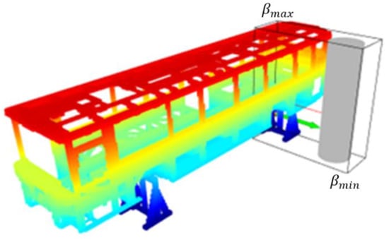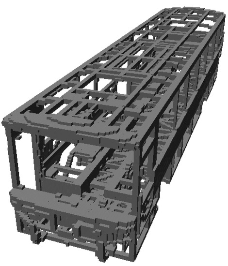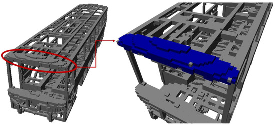 Mapping by CAD models is implemented by sampling points on the mesh of models. Thus, a point cloud, , ve , is obtained per each CAD model indexed with . Let be the total number of CAD models stored as separate files. CloudCompare, which is an open-source project for 3D point cloud and mesh processing software, is a software tool with the capability of converting 3D mesh models into point clouds [27]. The number of points representing the model is determined by either specifying the total (approximate) number of points to be sampled () or the surface density (number of points per square unit) , and the two parameters are reciprocal. CloudCompare is employed to convert number of CAD models into point cloud files. After obtaining point clouds for each model, the next step is to insert point clouds into the 3D occupancy map. OctoMap framework provides functions to integrate the point clouds into a volumetric occupancy map. Thus, the known objects in the workspace are represented in the occupancy map. If the workspace of the robotic system is surrounded by fences and statically structured, then the constructed map would be sufficient for reliable distance calculations. Since the use case demonstrated in this study is an industrial robotic inspection system that has a statically structured environment and fences surrounding it, the implementation of the methods just involves mapping by CAD models. Figure 2 includes a demonstration of map construction from CAD models. In Figure 3, one of the parts from the bus is selected, and respectively shows the mesh model, rendered view, and point cloud of the part. Then, the demonstration of a selected part on the occupancy map of the bus is provided in Figure 4.