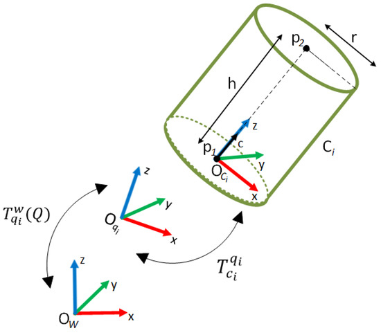 The cylinder axis is oriented along the-axis of the cylinder frame . Each cylinder representing any part of the robot needs to be defined with respect to a reference frame, , which is also the reference frame for other objects in the environment. The position and orientation of the cylinder can be represented by . However, the cylinders are fixed to robot link(s) in order to cover them while they are moving. For distance calculation to be effective and efficient, the quantity and dimensions of the cylinders must be properly determined. Therefore, the number and the size of cylinders should be chosen to cover as many parts and volumes as the physical structure of the robot. The number of cylinders and their positions may differ in various industrial setups. If each cylinder representing links of the robot is fixed to any link frame of the robot, say , and the fixed transformation is defined, then the position and orientation of the cylinders can be defined with respect to by the knowledge for any robot joint configuration. When is any configuration of the robot, , are the joint values, and is the number of joints for the robot.