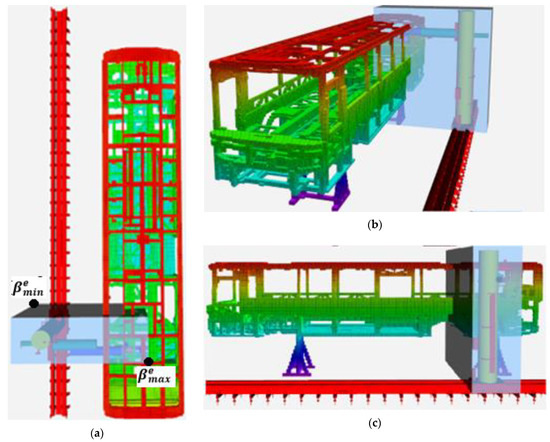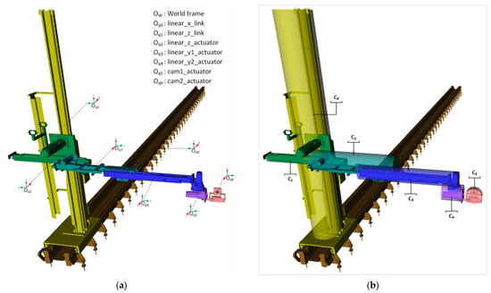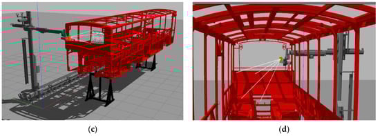 The application of the proposed method is achieved by a simulation-based robot verification testing tool (SRVT) [29]. The SRVT is a good representative of the ROKOS. It stimulates the ROKOS from task planning to 3D simulation with a dynamic engine and 3D visualization with the Gazebo Simulation environment [30]. In the proposed method, just one cartesian robot arm is used instead of two arms of the existing system. During the movement, the online distance tracker calculates the minimum distance between the links of the robot and the bus skeleton. Figure 10 shows the real (a) [31] and simulation environments (b–d).