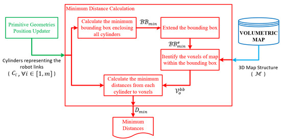 The minimum distance calculation is performed between the representations of robot links and the obstacles in the environment. Figure 8 shows the block diagram of the minimum distance calculation. The robot links are represented by cylinders, , and an octree-based 3D occupancy map, , represents the workspace of the robot. is composed of a set of free () and a set of occupied () voxels. A computational cost-efficient minimum distance calculation is implemented by decreasing the number of voxels in , which is involved in the minimum distance calculation. Therefore, a minimum bounding box, , is defined to enclose the cylinders representing robot links. and are the minimum and maximum corners of the rectangular prism, respectively. Then, the bounding box is extended by a scalar , such as , where and . Thus, the minimum distances for each cylinder can be searched over the occupied voxels in instead of searching all the occupied voxels in . Let be a set of occupied voxels such that and every center of voxels in are in .