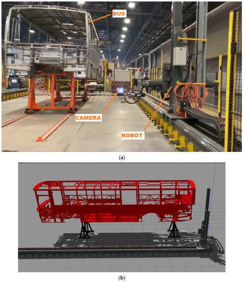 The proposed method is implemented for the use case with the name of an automated robot inspection cell for quality control of automotive body-in-white (ROKOS) in the VALU3S project [28]. The robotic inspection cell carries out quality control by utilizing the camera system mounted on the tips of two cartesian robots on both sides of the vehicle body. The data obtained from the CAD data of the large-bodied vehicle are compared with the actual data obtained from the camera system, and the presence/absence check for the parts composing the vehicle is performed. The ROKOS is produced for the quality control of a bus chassis which includes 2909 body parts. The ROKOS contains two cartesian robot arms and a bus skeleton. The robot arms follow a trajectory and take pictures of the skeleton at predefined positions.