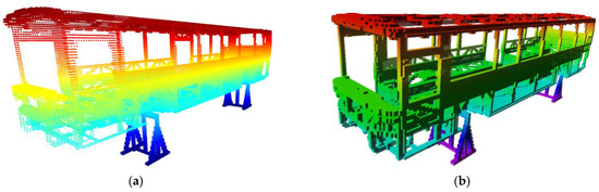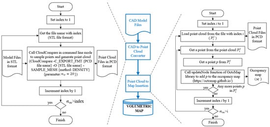 Figure 11 shows the flow diagrams for the mapping by CAD models. The CAD files are taken in STL format. The meshes of each CAD file are sampled points and the number of point cloud files are generated. The sampling of points is implemented by the surface density method with points per square unit. For the map, an octree structure is used with a 0.05 m resolution. Figure 12 shows the map of the bus.