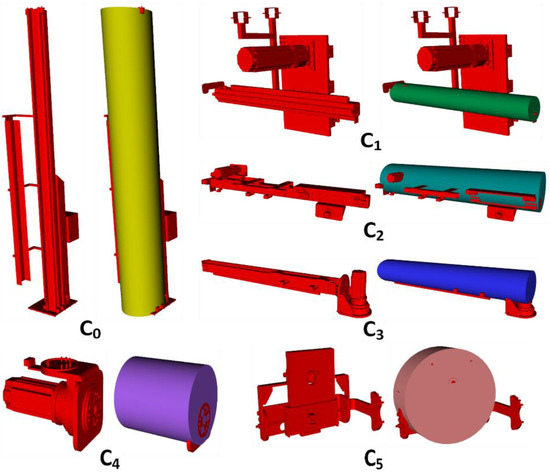 Six cylinders, , are defined for the representation of the links of the robot as seen in Figure 13. Moreover, the parameters of the cylinders are provided in Table 1.