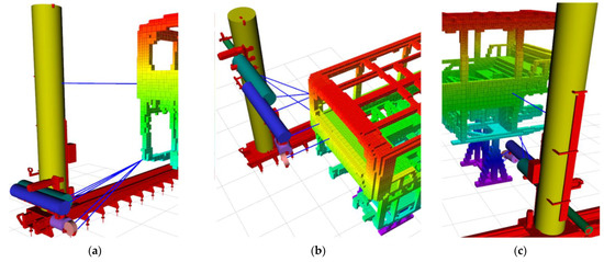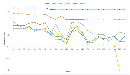 Figure 15 shows the minimum distances between cylinders and the map in a given period. During the period, the closest distance of C0 does not change noticeably as it only shifts on the x-axis parallel to the bus. C1 moves on the x-axis and z-axis, and the minimum distance is over 1 m throughout its motion. The cylinders C2, C3, C4, and C5 move all three axes (x, y, z). The 110th s is the first time that all cylinders together obtain the closest distance to the bus. At this time, the nearest distances for C2, C3, C4, and C5 are 0.34 m, 0.18 m, 0.13 m, and 0.31 m, respectively (see Figure 16c).