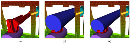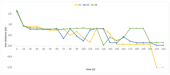 The dimensions of cylinders are crucial for the representation of the robot links. The dimensions should be the smallest values that cover the links. Otherwise, the minimum distances cannot be reliable. For instance, at 210 s, the minimum distance of C3, which is −1, indicates a collision between C3 and the bus (see Figure 15). However, in the real system, there is no collision between the links of the robot and the bus. The reason is that the cylinder dimensions are chosen larger than they must be. The radius of the cylinder must be adequately close to the related link of the robot. Therefore, C3 is tested with three different radii to find the optimum radius. Figure 17 presents the minimum distances of C3 for three radii. As can be seen in the figure, the robot completes its movement without collision if a consistent radius is employed (r3 = 0.124). Even if the robot performs its movement without any collision with the r2 radius, it needs to be chosen as the nearest one for realistic distance results. Figure 18 shows the representation of the C3 with the new and old radii.