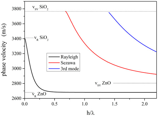 With very thin film thicknesses (h/λ up to about 0.61), only the Rayleigh mode propagates; the Sezawa mode appears as it exceeds its cut-off value (h/λ > 0.61). With further increases in h/λ, the third and higher order Rayleigh modes appear whose velocities asymptotically reach the shear bulk wave velocity in ZnO. Depending on the ZnO h/λ, one mode or more than one mode can propagate in the ZnO/SiO2 substrate.