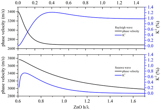 The surface AE response of both the Rayleigh and Sezawa waves has the same shape regardless of the type of propagating medium (whether it is a ZnO half-space or a ZnO/SiO2 substrate), as shown in Figure 4. The magnitude of the relative velocity drop and attenuation peak are equal to K2/2 and K2/4, as predicted by the perturbation theory: the larger the K2, the larger the expected conductometric sensitivity.