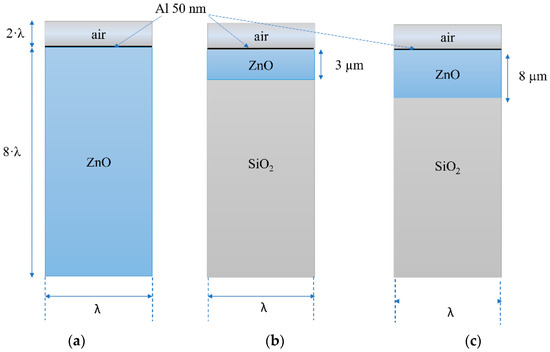 The unit cell made of (a) air/Al (50 nm)/ZnO half-space; (b) air/Al (50 nm)/ZnO (3 μm)/SiO2 half-space; (c) air/Al (50 nm)/ZnO (8 μm)/SiO2 half-space. The picture is not in scale.