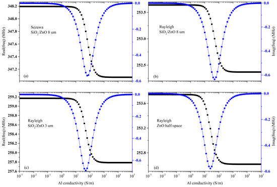 The real and imaginary part of the resonant frequency vs. Al conductivity of the (a) Sezawa wave travelling along Al/ZnO (8 μm)/SiO2 substrate; (b) Rayleigh wave travelling along the Al/ZnO (8 μm)/SiO2 substrate; (c) Rayleigh wave travelling along Al/ZnO (3 μm)/SiO2 substrate; (d) Rayleigh wave travelling along a ZnO half-space covered by the thin Al layer. The acoustic wavelength is λ = 10 um and the Al layer is 0.05 um thick.