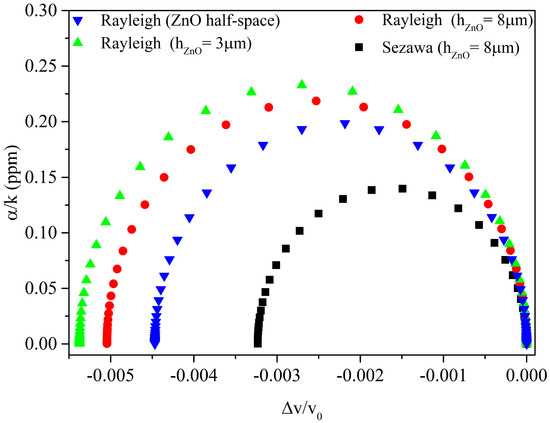 As an example, Figure 5 shows the relative phase velocity shift, , vs. the α/k curves, for the Rayleigh and Sezawa waves in the three configurations of Figure 3, k being the wavevector, α being the propagation loss of the wave, , and the Al conductivity being the parameter.