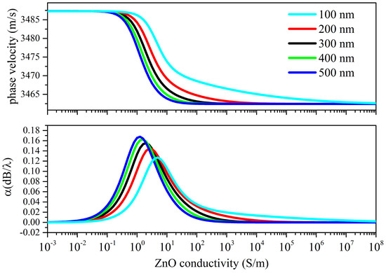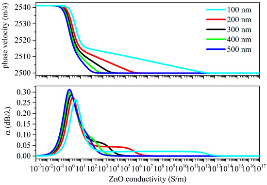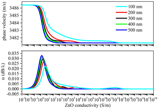 Figure 10 and Figure 11 show the Sezawa wave velocity and attenuation vs. the ZnO conductivity curves under the top and bottom configurations.