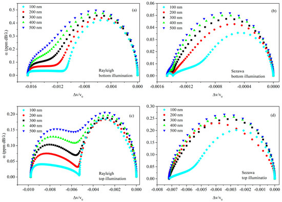 The propagation loss vs. the σ curves of the Rayleigh wave under the top illumination (Figure 8) show two peaks of different amplitudes: the dominant peak is downshifted respect to the single peak of the surface AE effect; the second small peak moves toward the larger one with increasing δUV and somewhat merges to the first peak at δUV = 500 nm. The amplitude of the large peaks increases with increases in the δUV.