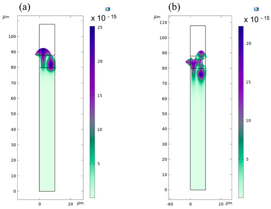 Two different UV lighting conditions were considered: 1. top lighting, when the source of UV light is placed above the ZnO/fused silica; 2. bottom lighting, when the optical source is below the ZnO/fused silica. As a result, the conductivity profile of the ZnO layer is directed upwards under bottom illumination and downward under top illumination as shown in Figure 6a,b, where the colored gray scale represents the photoconductivity profile inside the ZnO layer under top and bottom illumination.