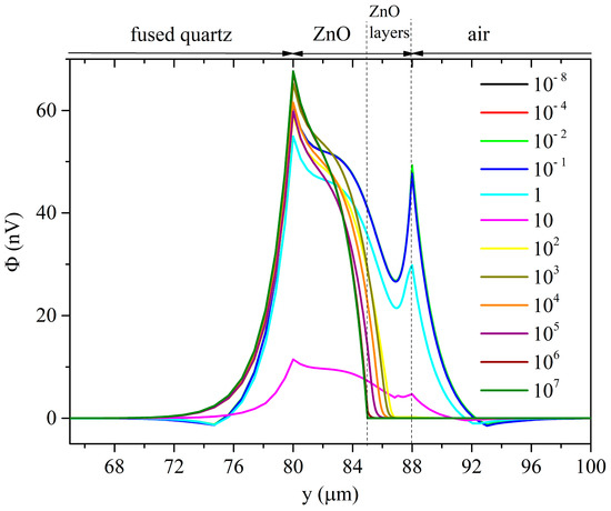Under UV illumination, the distribution of the electrical potential within the ZnO layer is affected by a perturbation which causes the electrical conductivity to grow in magnitude and within deeper and deeper layers. Figure 17 and Figure 18 show, as examples, the electric potential distributions under the Sezawa mode at some conductivity values (the running parameter), under top and bottom illumination, and assuming δUV = 200 nm.