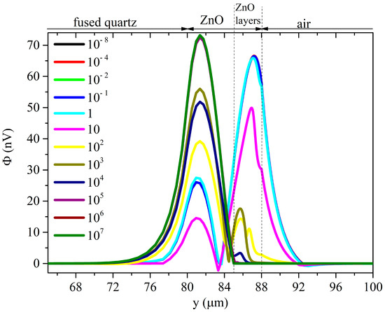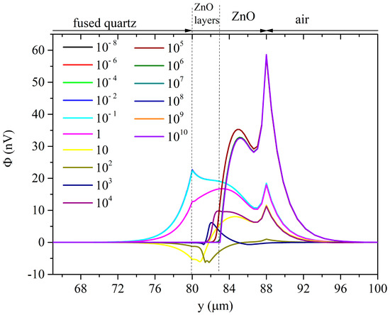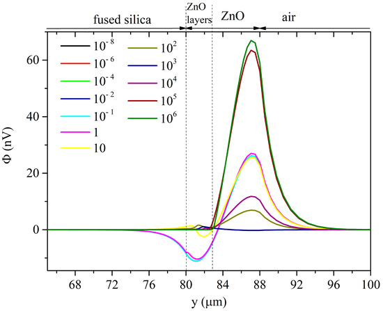 With increasing conductivity, the potential Φ of both the two waves becomes null inside the perturbed stacked region; the ZnO layer is now divided into two parts—a conductive lossy layer and an unperturbed piezoelectrically active layer. Φ is short circuited in the former layer; in the latter layer, Φ satisfies the continuity boundary condition with the potential in the stacked region and in the other side (which can be air or fused silica, depending on the UV illumination type). As a result, the electric potential of the Rayleigh wave is concentrated inside the piezoelectrically active portion of the ZnO layer (not involved in the UV adsorption) where it reaches a peak at the fused silica/ZnO interface or at the ZnO/air interface, for top and bottom illumination, respectively: the magnitude of the peak under top illumination is larger than that under the bottom one. The electric potential of the Sezawa wave reaches a peak value and then it decreases just before the interface with air or with the substrate; the magnitude of the peak is larger under the bottom illumination than that under the top one.